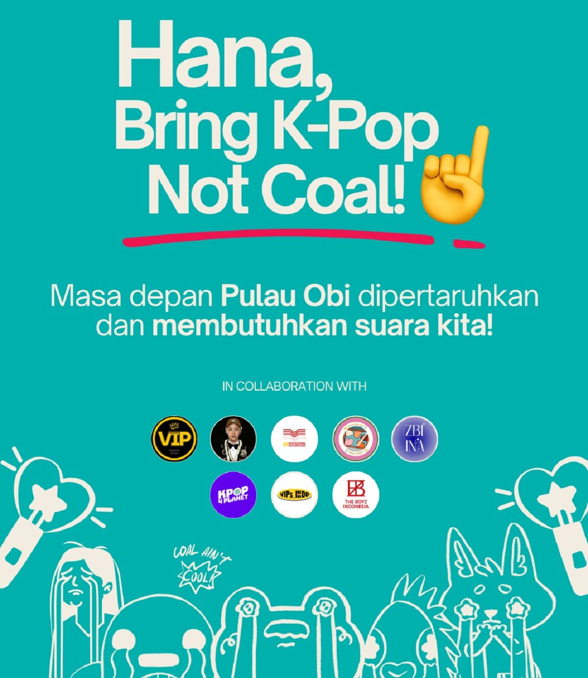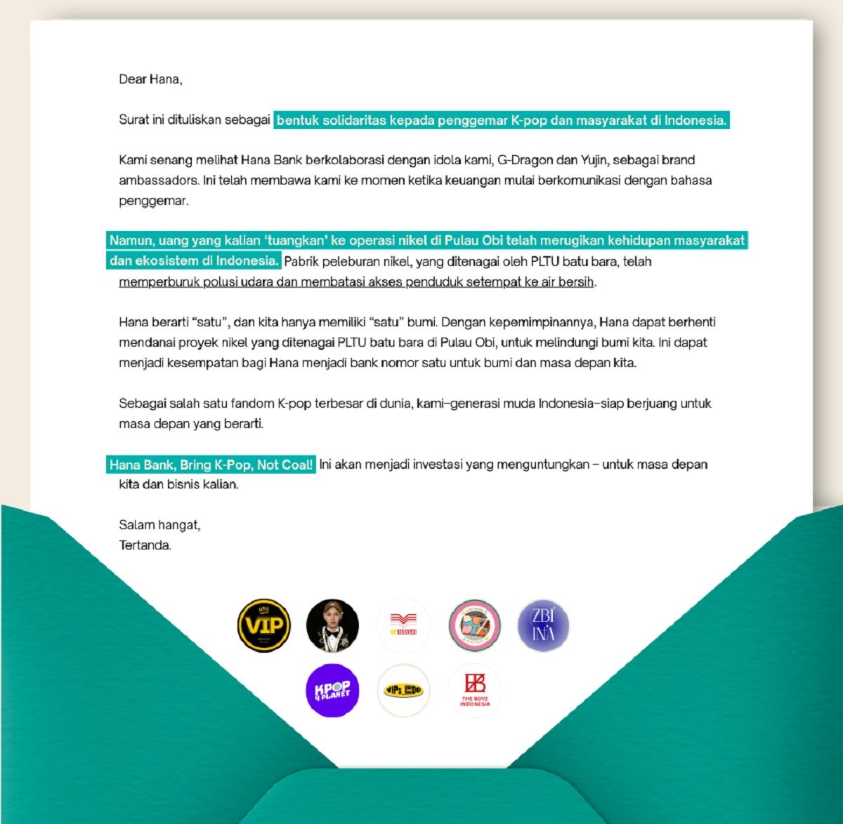 Indonesiasenang-, Gerakan iklim KPOP4PLANET bersama para penggemar G-Dragon di Indonesia menyampaikan surat terbuka kepada Hana Bank untuk mendesak penghentian pendanaan terhadap proyek nikel di Pulau Obi, Maluku Utara. Aksi ini dilakukan bertepatan dengan Hari Hak Asasi Manusia dan Hari Hak Asasi Hewan Sedunia.