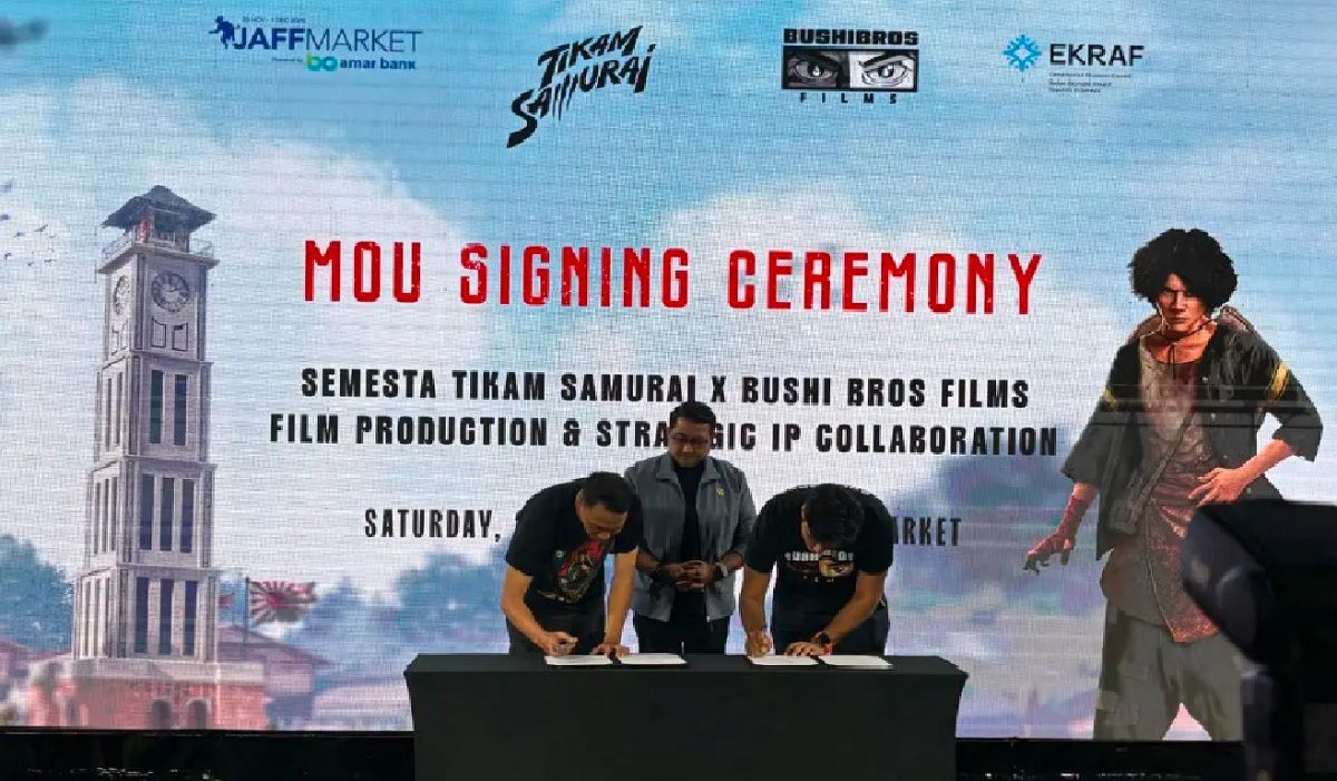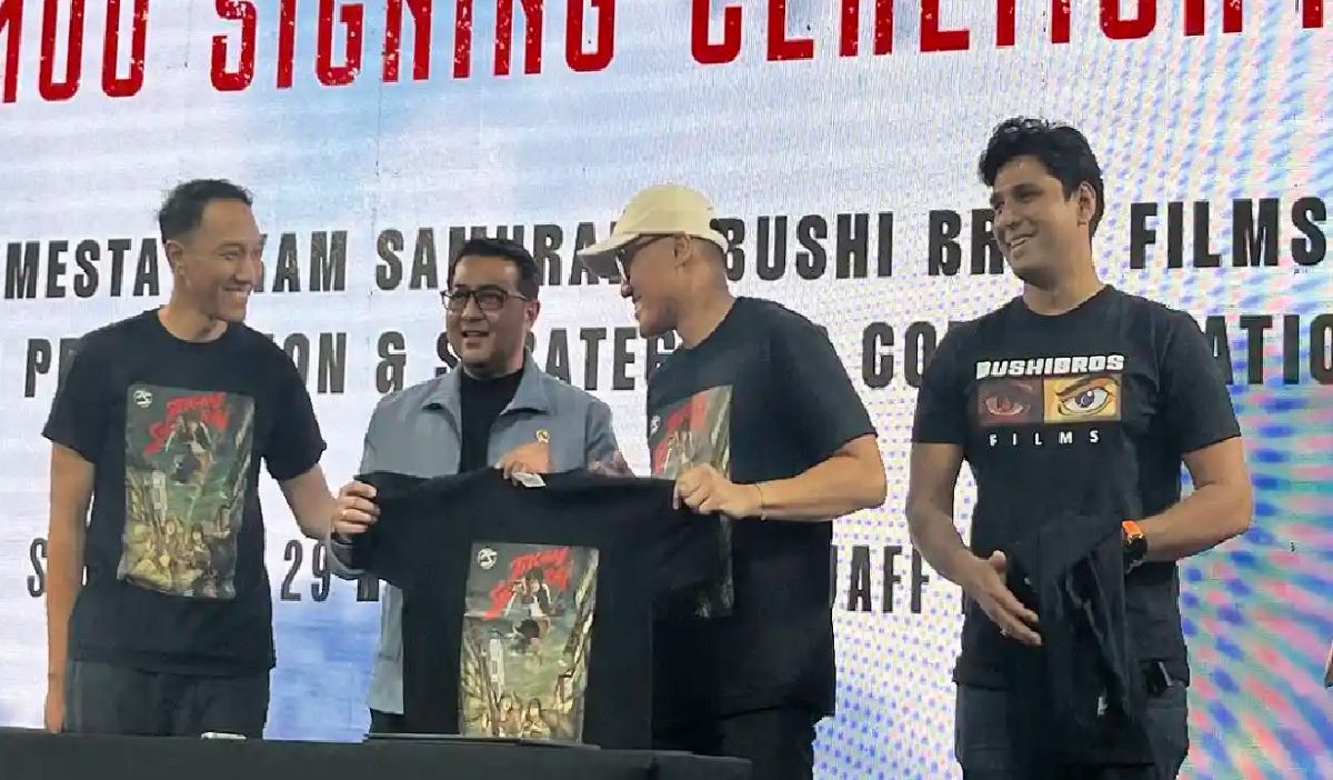 Indonesiasenang-, Dukungan terhadap karya budaya Indonesia memasuki babak baru dengan resminya penandatanganan MoU produksi film Tikam Samurai. Kesepakatan ini terwujud antara PT Semesta Tikam Samurai dan Bushi Bros Films dalam acara JAFF Market di Jogja Expo Center, Sabtu (29/11/2025), dan disaksikan langsung oleh Menteri Ekonomi Kreatif RI, Teuku Riefky Harsya.