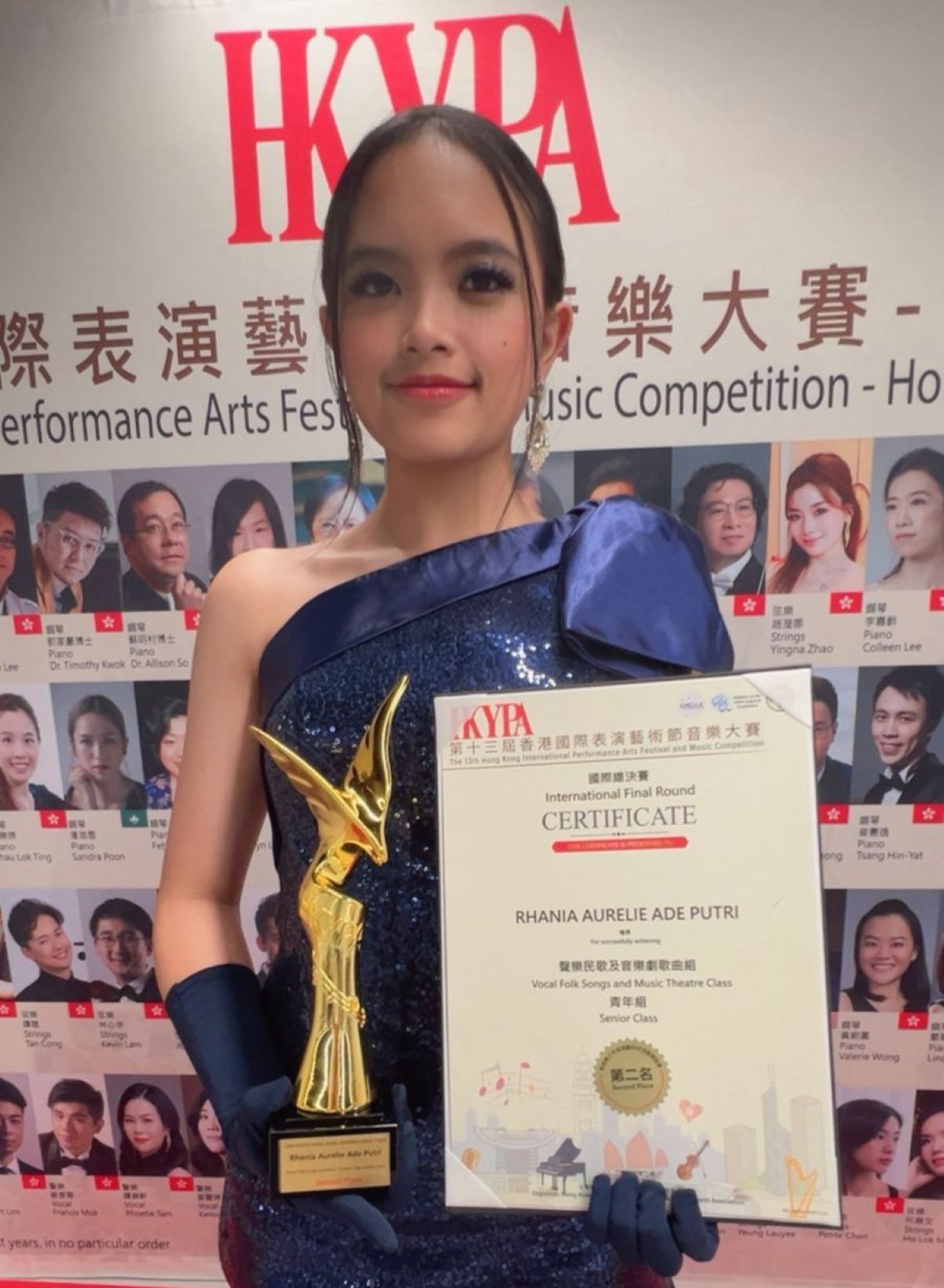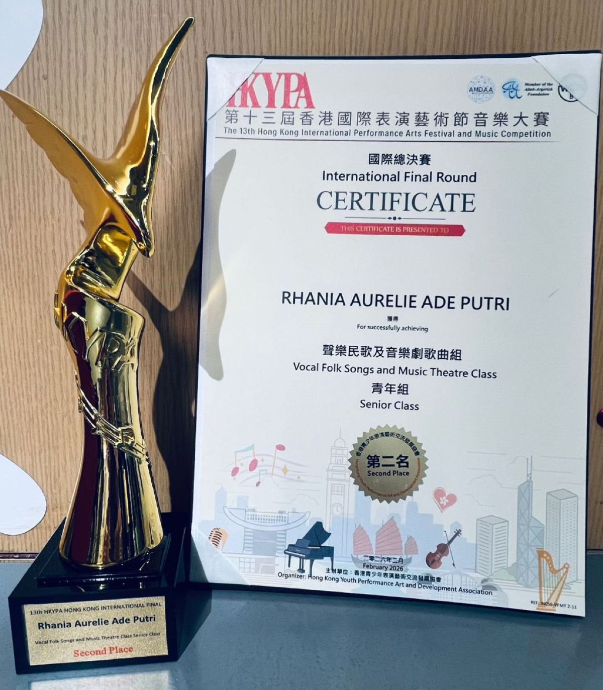 Indonesiasenang-, Di usia ketika sebagian remaja masih sibuk mencari jati diri, Rhania Aurelie Ade Putri W justru telah menorehkan peta prestasi yang melampaui batas usia dan negara. Penyanyi muda asal Medan ini kembali mencuri perhatian setelah meraih Second Place Vocal Folk Song and Music Theater Class pada ajang HKYPA Hong Kong International Youth Performance Art Festival and Music Competition yang digelar pada 6–8 Februari 2026.