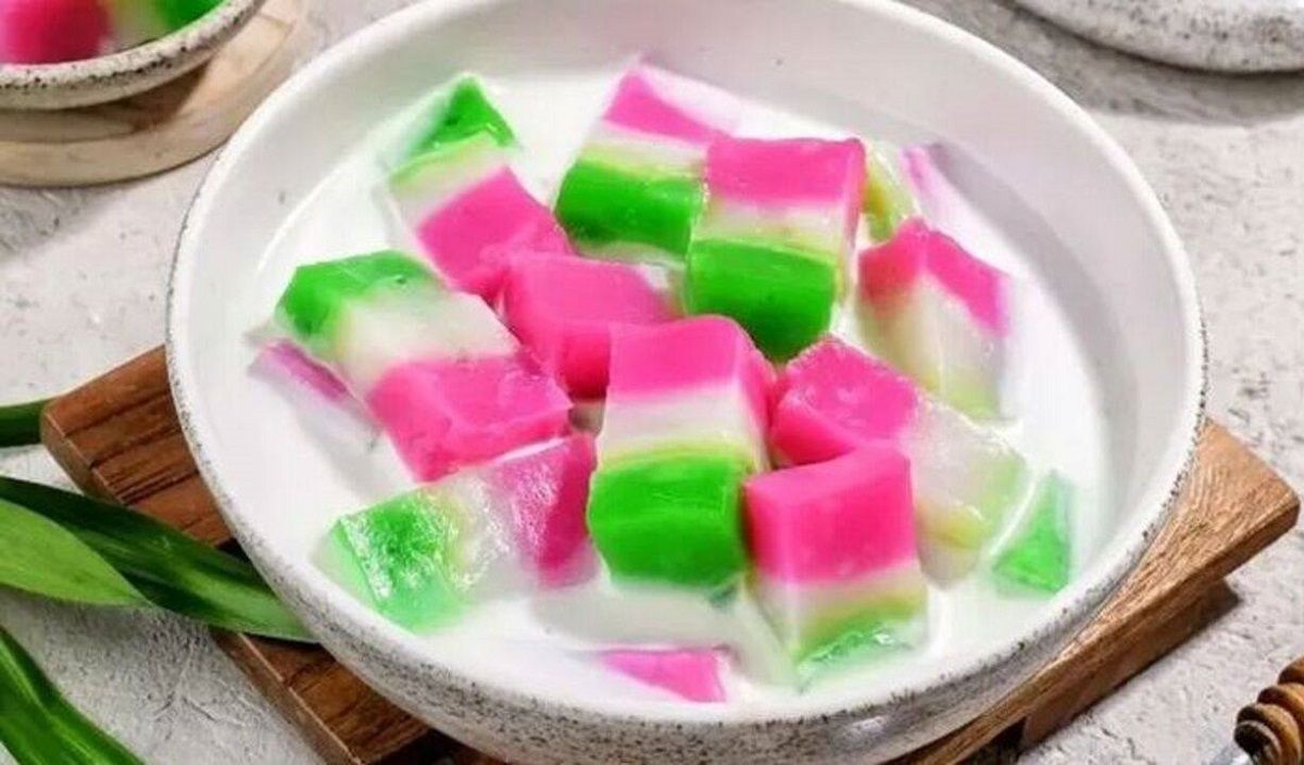 Agar tampil lebih menarik, dessert tradisional ini biasanya disajikan dalam gelas atau mangkuk, dilengkapi sendok keramik putih dan hiasan daun pandan. Teksturnya yang menyerupai puding atau kue lapis menjadikannya kerap disebut sebagai “kue lapis versi minuman”.